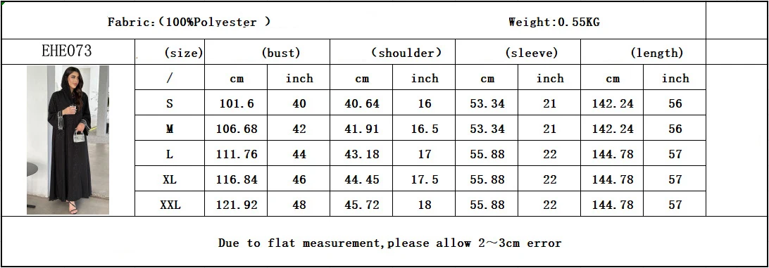 Material:polyester Color: as photo show Size: S M L XL 2XL Sleeve Length: Long SLeeve Occasion: Casual / Party / Cocktail / Evening Condition: 100% New and high quality package include: 1*Abaya Please refer to the size table.